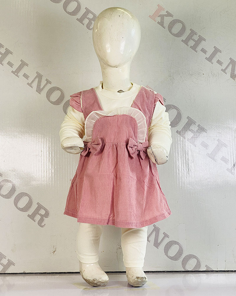 This adorable two-piece outfit features a dusty rose corduroy pinafore dress with a ruffled heart-shaped bib and two charming bows at the waist. Paired with a soft cream ribbed long-sleeve top and matching leggings, it's a cozy and stylish pick for everyday elegance.