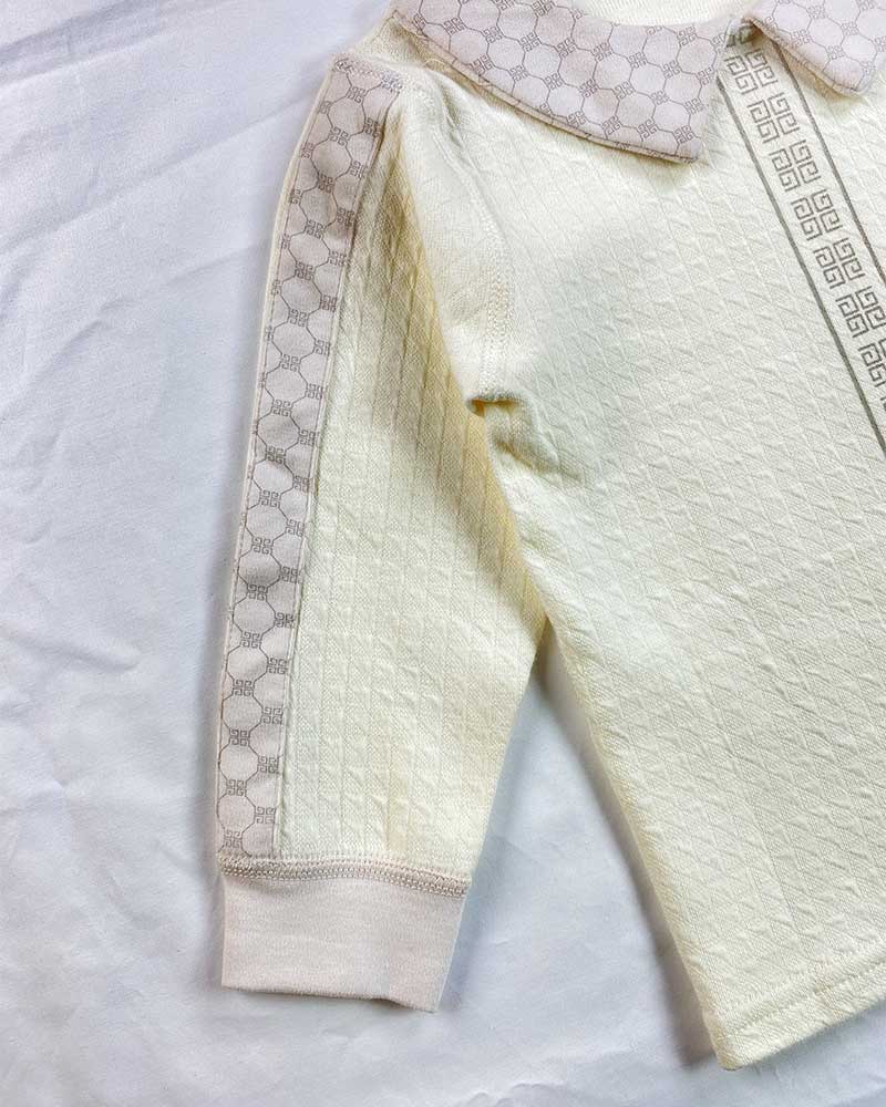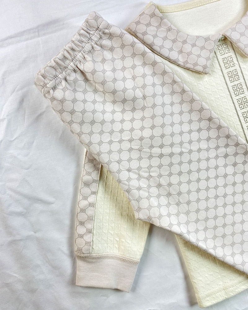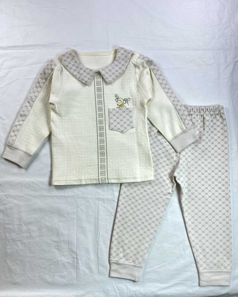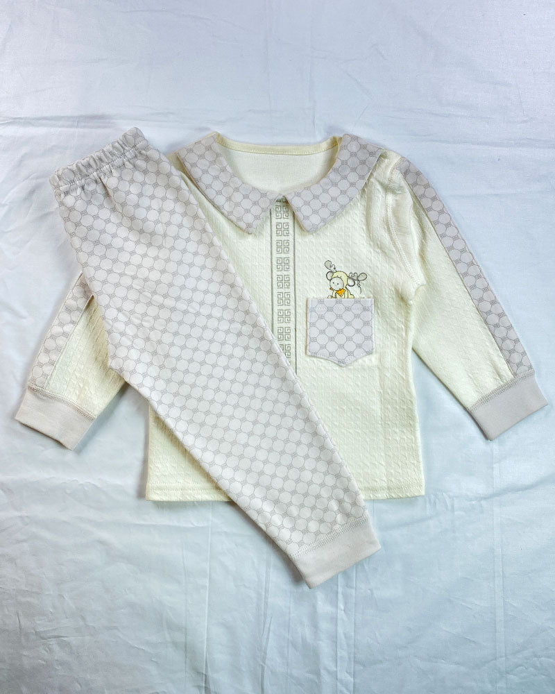 Keep your little one cozy and stylish at bedtime with this soft cotton nightwear set. Featuring a cream-colored top with a wide printed Peter Pan collar and matching accents along the sleeves and center placket. The cute front pocket and cartoon bee motif add a playful touch, while the coordinating printed bottoms complete the look.