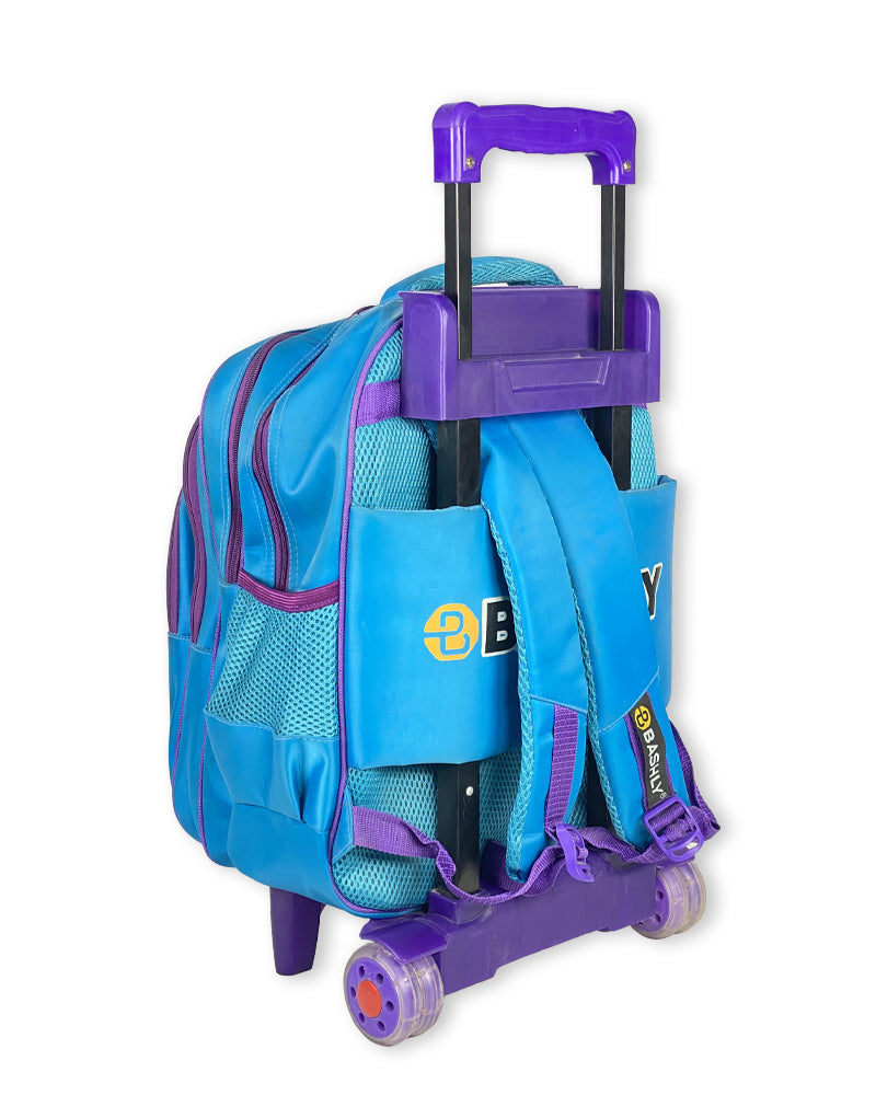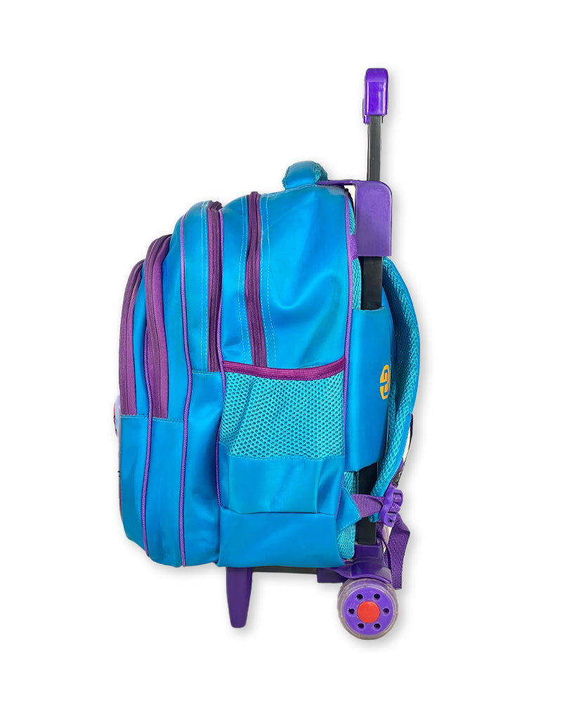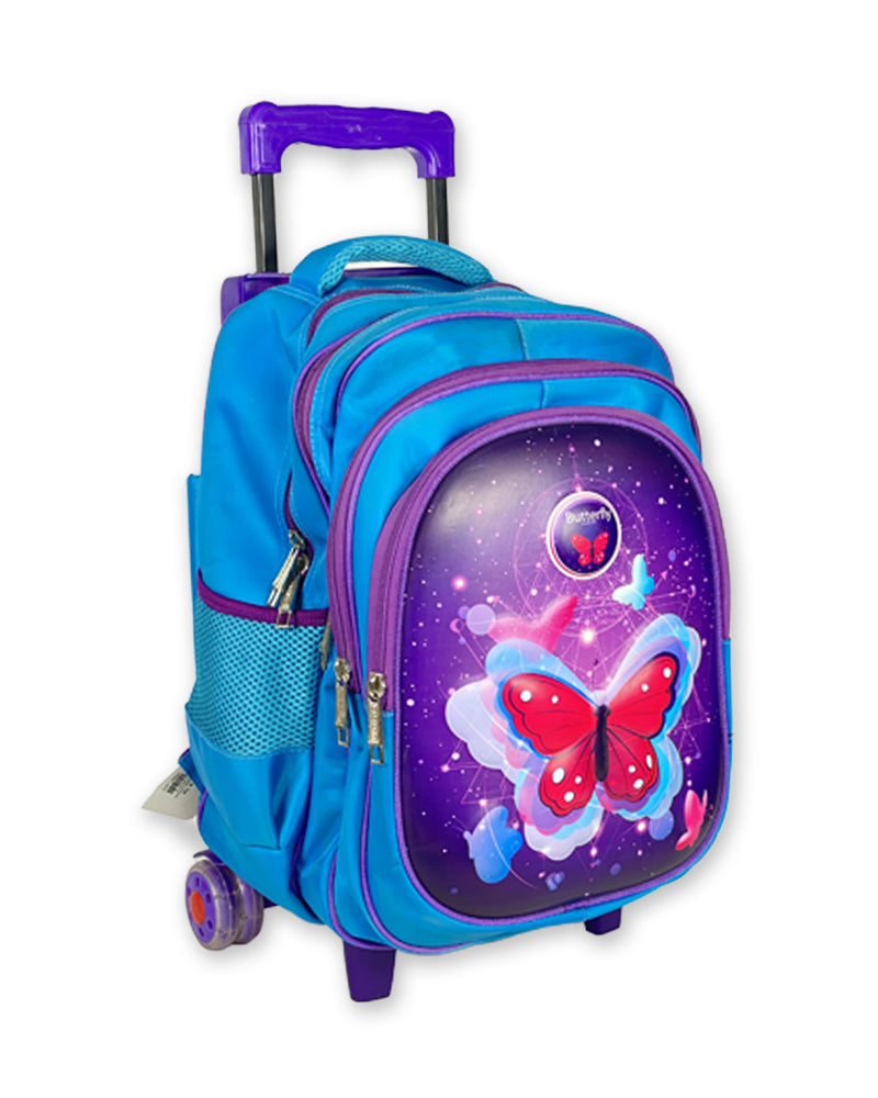 This butterfly-themed rolling backpack is a practical and stylish choice for young girls. Designed in vibrant shades of blue and purple, it features a beautifully printed butterfly graphic that adds charm while also standing out in a crowd. Ideal for daily school use, trips, and weekend getaways, this trolley school bag combines function, durability, and a fun aesthetic.