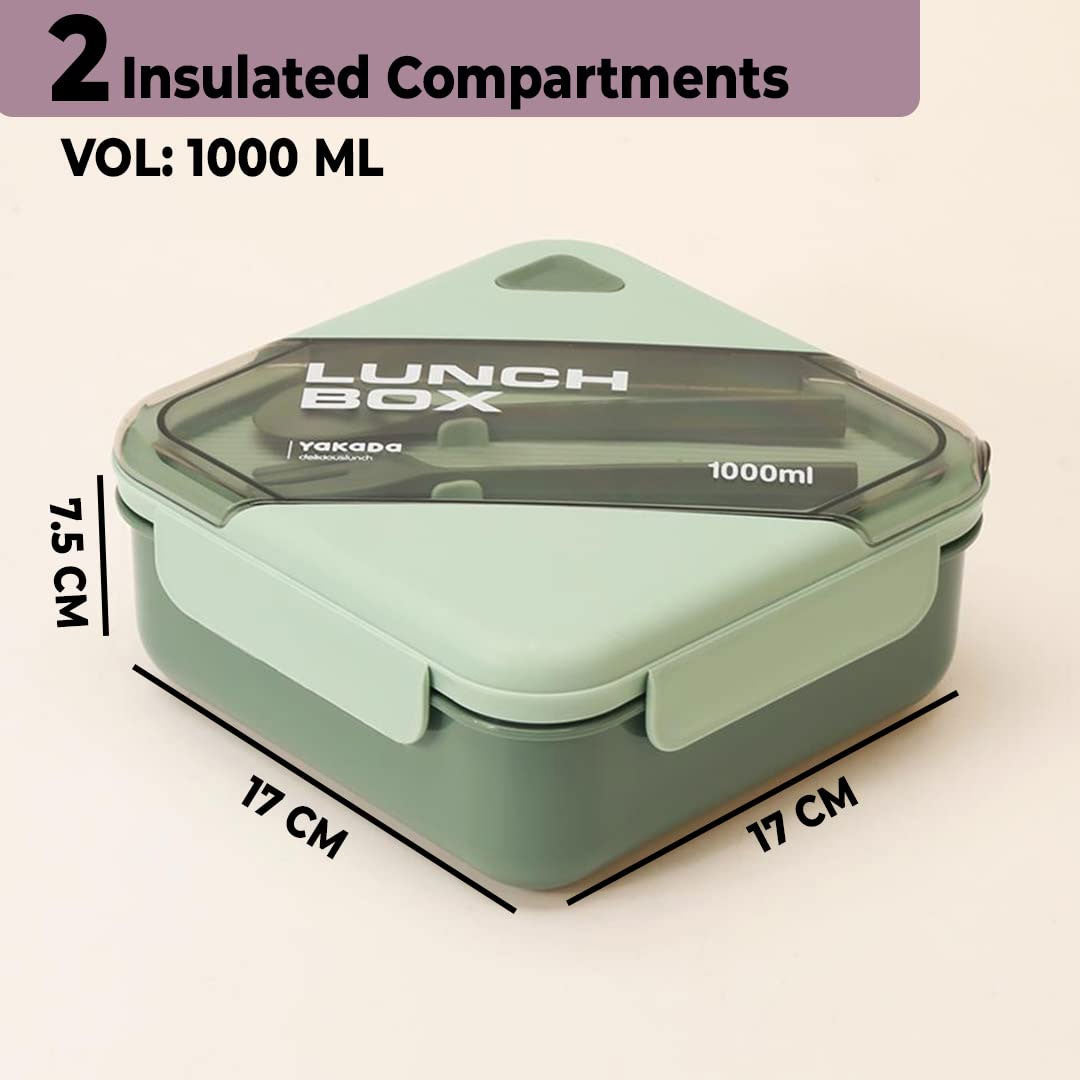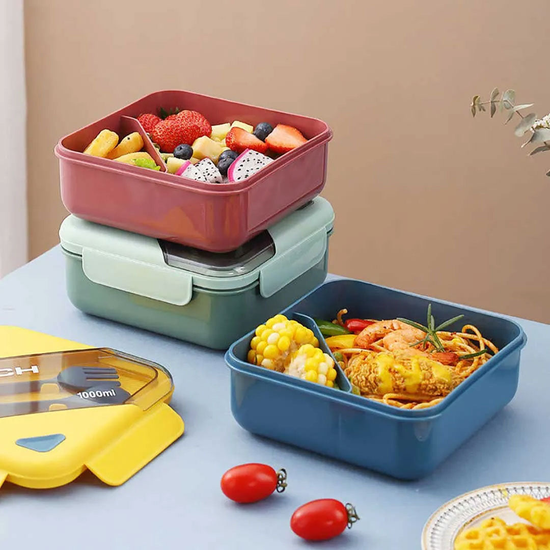 Designed for convenience and aesthetics, this 1000ml square lunch box comes with a fork and spoon set neatly stored in a transparent lid. Ideal for office, school, or on-the-go meals.