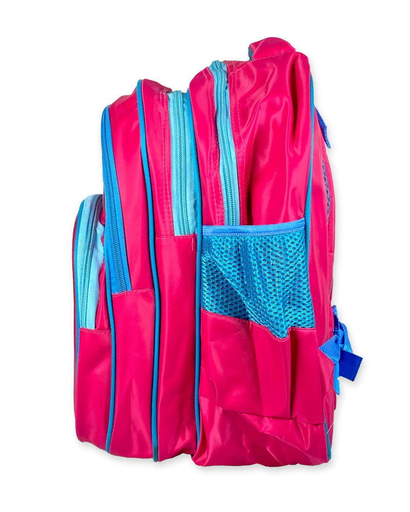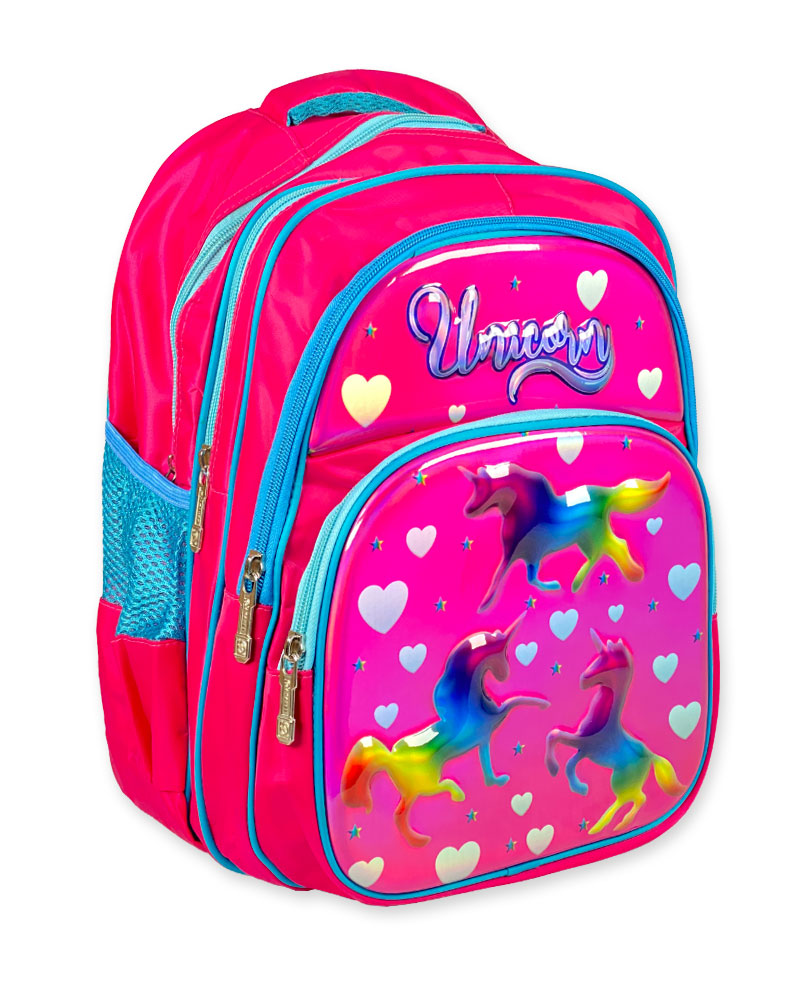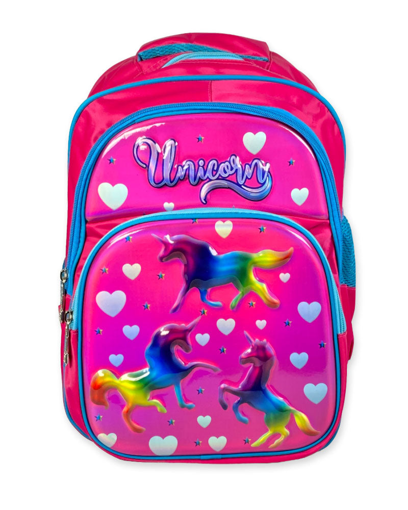 Bright pink unicorn-themed backpack with rainbow accents, perfect for school-going girls who love magic and colors.
