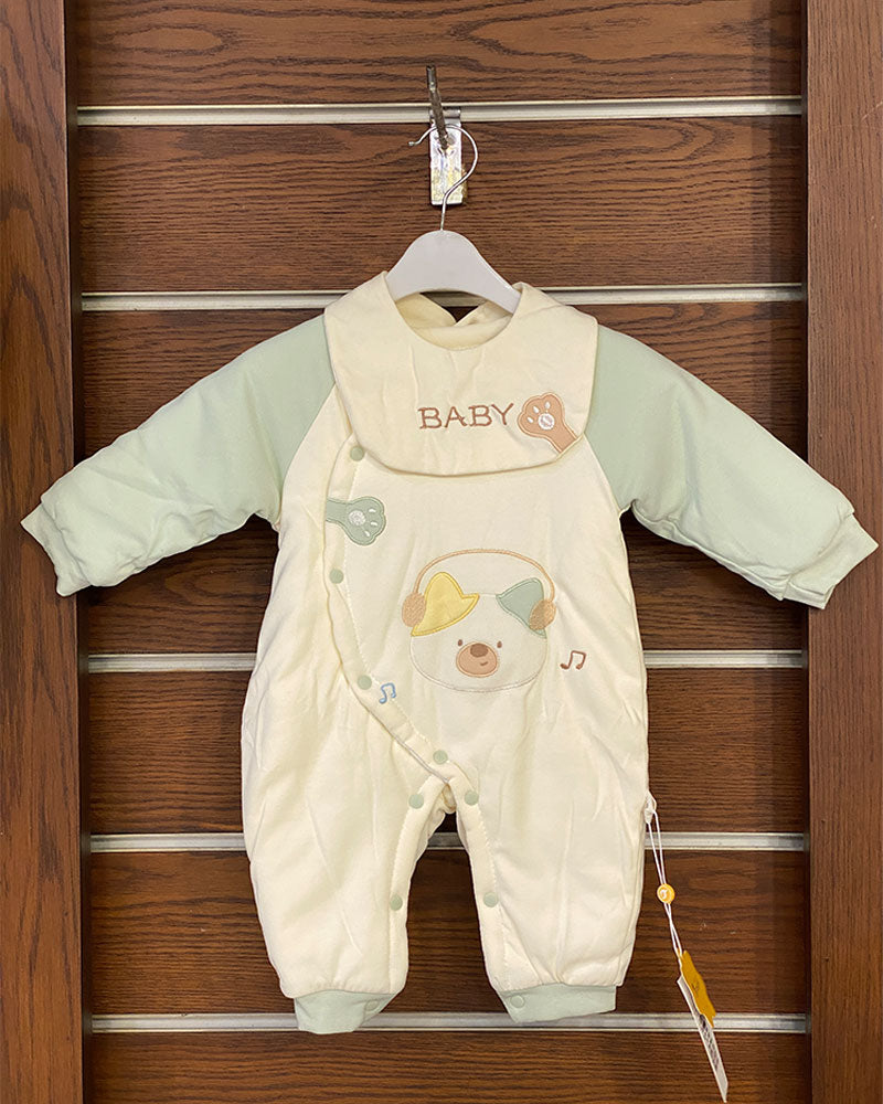 Add a dash of fun and freshness to your baby’s wardrobe with this cute bear-in-headphones romper in soft mint and cream tones.